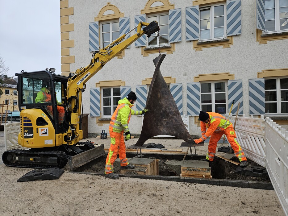 „Der Geher“ von Otto Süßbauer ergänzt die Geretsrieder Kunstmeile. Die Bronze-Figur wurde am 27. November 2025 vor dem Rathaus aufgestellt. Wir bedanken uns bei den Kollegen vom städtischen Bauhof für die Präzisionsarbeit! Wenn der Beton getrocknet ist, wird daneben noch ein Baum gepflanzt.