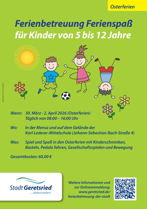 auch im Jahr 2026 wird die städtische Ferienbetreuung "Ferienspaß" für Kinder zwischen fünf und zwölf Jahren angeboten. Die Anmeldung zur Betreuung in den Osterferien kann Anfang des Jahres 2026 vorgenommen werden.
