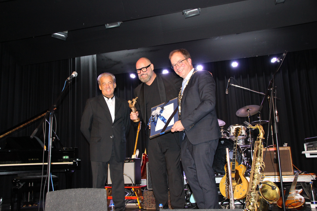 Sichtlich erfreut und gerührt bedankte sich Florian Sagner für seine Auszeichnung, einer Urkunde und der Kleinplastik „Der Trompeter“ des Künstlers Ernst Grünwald. Er begeisterte mit verschiedenen Trompetensoli bis schließlich die Band „The Stimulators“ mit den Gästen Paloma und Titus Vollmer den Saal zur bebenden Tanzbühne werden ließen. Herzliche Gratulation an Florian Sagner!
