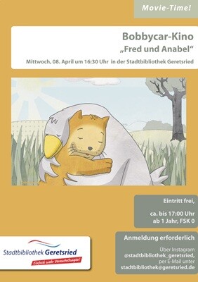 Die Stadtbibliothek lädt, bei der Movie-Time, zum Bobbycar-Kino ein. In dem animierten Kurzfilm „Fred & Anabel“ begleiten wir die unzertrennlichen Freunde Fred, die Katze und Anabel, die Gans. Doch dann kommt der Herbst. Anabel beginnt zu frieren und es wird Zeit für sie in den zu fliegen. Fred vermisst seine Freundin sehr und erinnert sich an ihre gemeinsamen Momente. Auch Anabel hält es ohne Fred kaum aus. Doch auch der längste Winter geht irgendwann vorbei. Liebenswürdiger Animationstrickfilm über eine große Freundschaft.