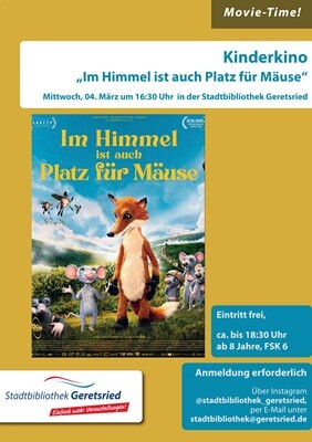 Es ist wieder Movie-Time in der Stadtbibliothek, wir laden zum Kinderkino ein. In dem animierten Abenteuerfilm „Im Himmel ist auch Platz für Mäuse“ hat das vorwitzige Mäusemädchen Dalli, gerade noch dem schlafenden Fuchs ein Stück Fell gemopst, um zu beweisen, dass sie eine wahrlich tapfere Maus ist - und schon im nächsten Moment wacht sie im Himmel auf! Zunächst staunt sie angesichts der ungewohnten Umgebung und freut sich über die wunderlichen Tiere, die hier für Ordnung sorgen, dann aber wird ihr bewusst, dass sie tot ist. Zu allem Überfluss ist auch der Fuchs tot, dieser durch und durch böse Kerl!