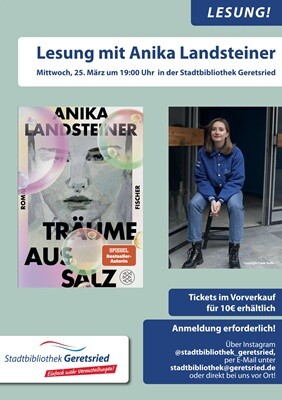 Die Stadtbibliothek Geretsried hat am Mittwoch, den 25. März 2026 die Münchner Spiegel-Bestseller-Autorin und Journalistin Anika Landsteiner zu Gast. In ihren Romanen widmet sie sich gesellschaftlichen Ungerechtigkeiten, Tabuthemen, Feminismus und Popkultur. Auch ihr im März neu erscheinender Roman „Träume aus Salz“ verspricht ein intensives Leseerlebnis.