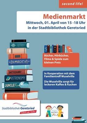 Die Stadtbibliothek Geretsried lädt zum Medienmarkt ein. Die Wuselvilla sorgt für leckeren Kaffee und Kuchen, so dass für die entsprechende Stärkung gesorgt ist.